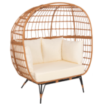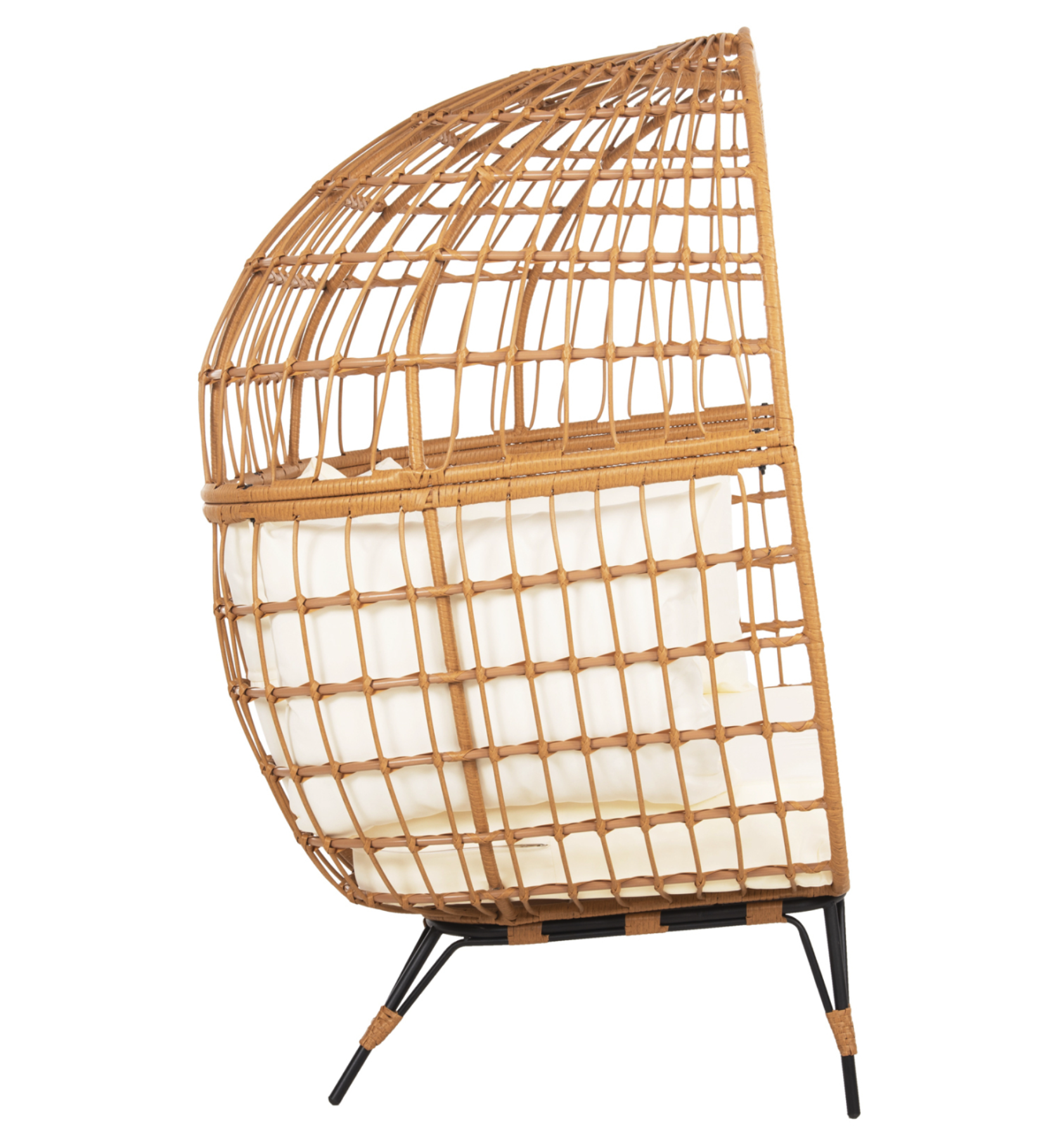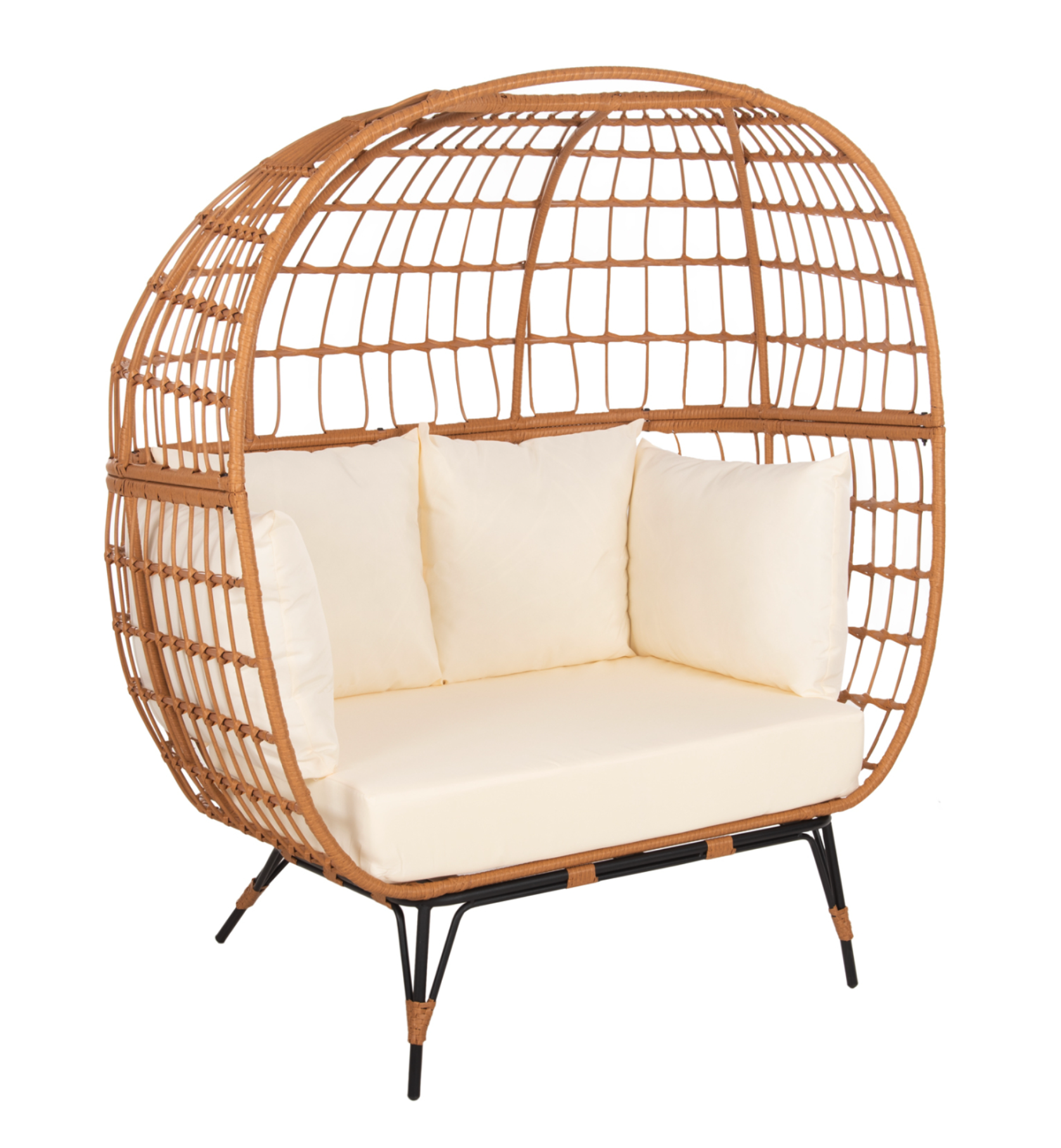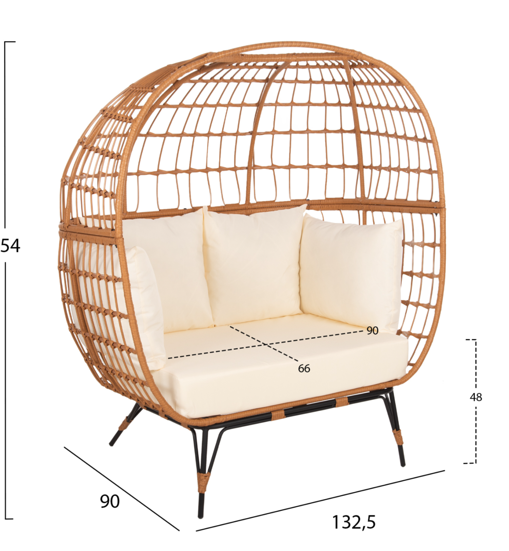 Η πολυθρόνα 2 ατόμων  είναι μια μοντέρνα, άνετη και ιδιαίτερη κατασκευή! Χρωματικά, είναι ελκυστική με την μαύρη μεταλλική βάση που καταλήγει σε 4 πόδια και το ΜΠΕΖ rattan που σχηματίζει την μεγάλη φωλιά με ουρανό η οποία και αποτελεί την πολυθρόνα. Η άνεση που προσφέρει είναι απαράμιλλη μιας και μπορεί άνετα να φιλοξενήσει 2 άτομα. Σε αυτό βέβαια βοηθούν και τα αναπαυτικά μαξιλάρια σε ΜΠΕΖ χρώμα στο κάθισμα αλλά και στα μαξιλάρια πλάτης, όπως και τα δύο μικρότερα στο πλάι. Αυτή η πολυθρόνα θα ταιριάξει σε πολλούς διαφορετικούς χώρους χάρη στην ιδιαίτερη κατασκευή της και είναι σίγουρο ότι θα τραβήξει όλα τα βλέμματα! Τα έπιπλα κήπου & εξωτερικού χώρου από rattan όπως αυτή η πολυθρόνα είναι η ιδανικότερη και η πιο έξυπνη επιλογή, αφού συνδυάζουν υψηλή αντοχή, άνεση, ποικιλία σχεδίων και χρωμάτων, καλύπτοντας την αισθητική άποψη του καθένα, κλασσική ή μοντέρνα.